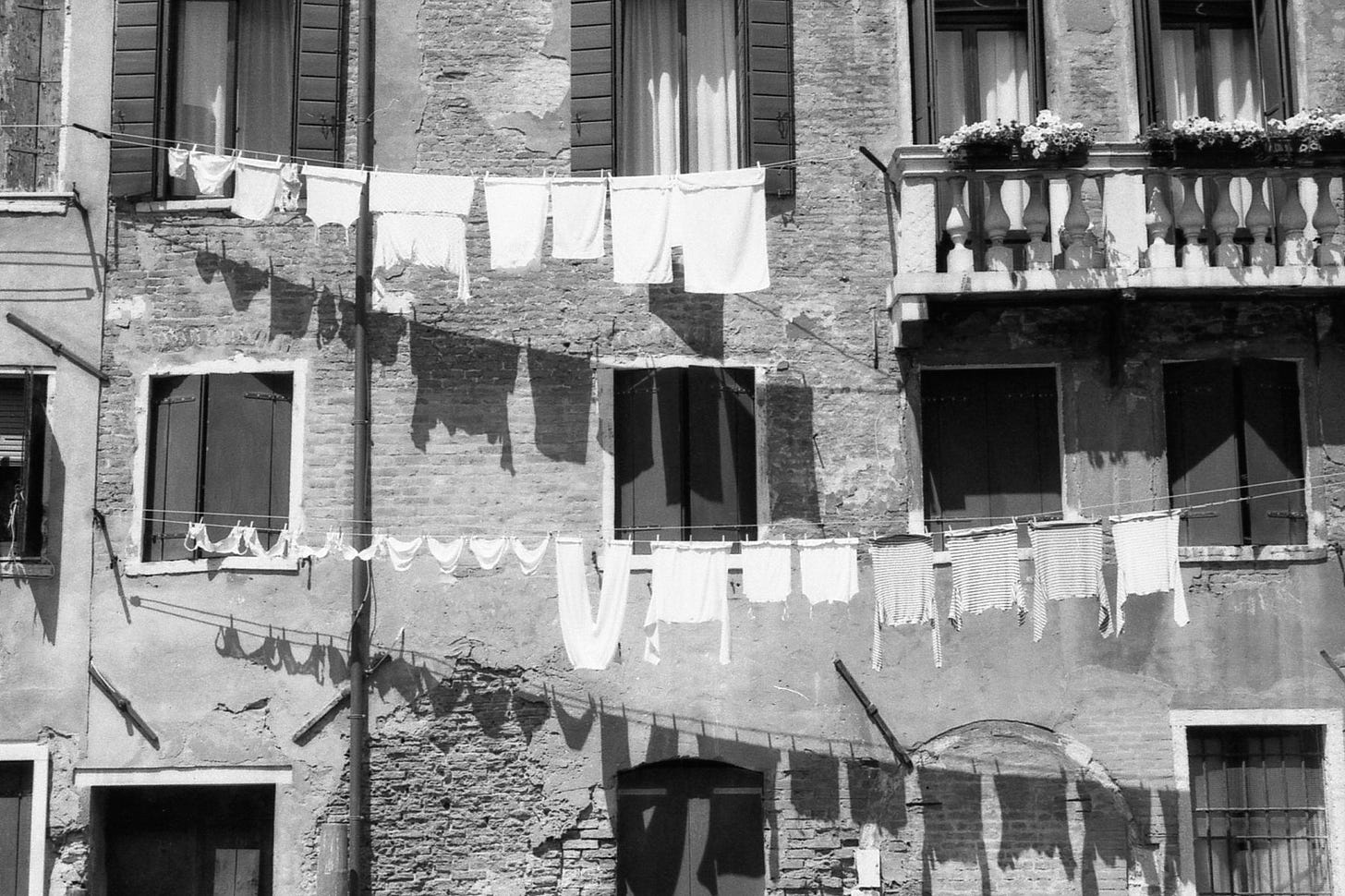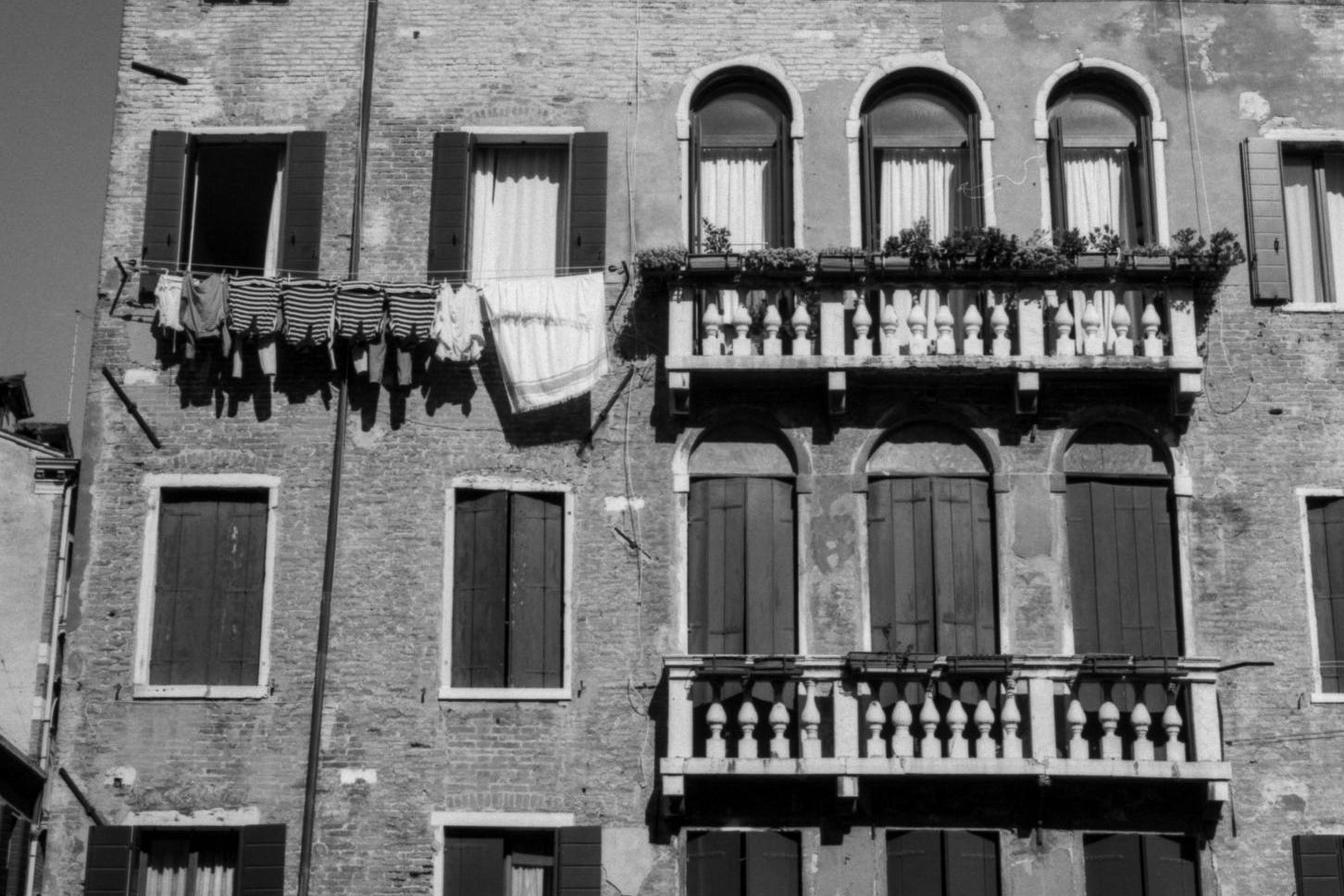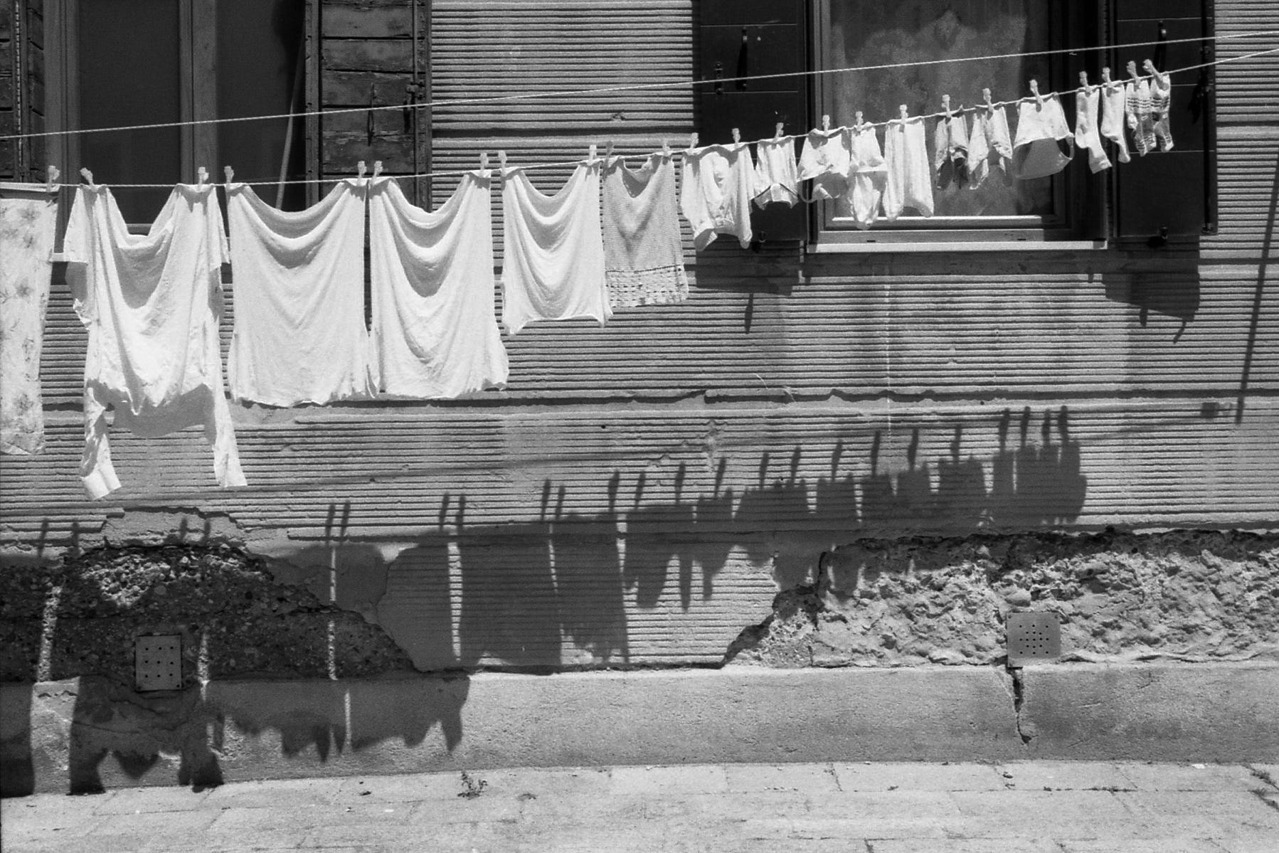 It is a well known fact: Every photographer loves a great laundry shot. The play of light and shadow. Unusual shapes. Whether in colour, or black + white. It is near impossible to make photographs of Venice that have not already been done. I have about 2000 negatives of Venice spanning near 40 years. Some of these have laundry in them. In fact, a lot of laundry has been eternalised on my negatives.