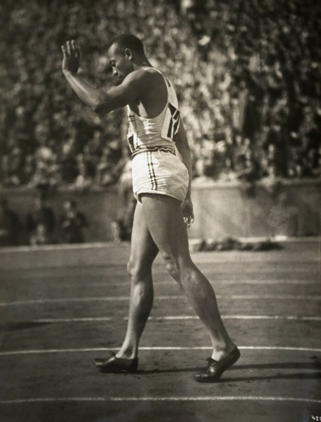 [Leni Riefenstahl: Jesse Owens preparing for the long jump. Berlin Olympics, August 1936, vintage print]