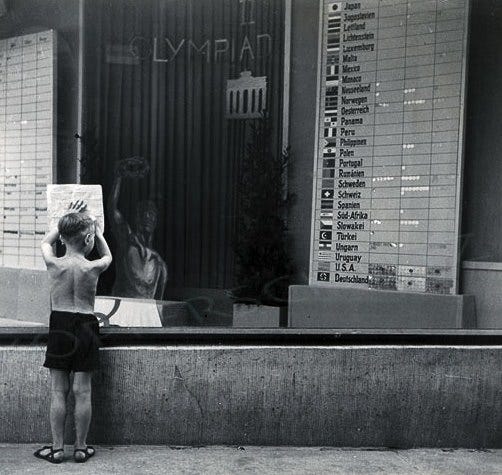 [Attributed to ‘Alberti’ from Bautzen, Germany: Young boy keeping track of the medal count, Berlin Olympics, 1936]